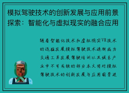 模拟驾驶技术的创新发展与应用前景探索:智能化与虚拟现实的融合应用