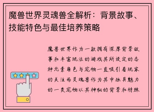 魔兽世界灵魂兽全解析:背景故事、技能特色与最佳培养策略