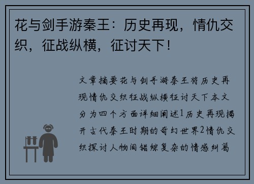 花与剑手游秦王:历史再现,情仇交织,征战纵横,征讨天下!